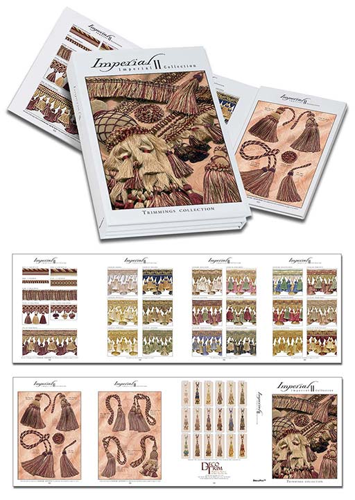 Inquire about the Imperial II Collection Sample Book. Measuring 11" x 16" closed, it showcases live samples of all available Imperial II trims, color swatches showing all available colors, as well as photos of the tassel and tie back suites.
